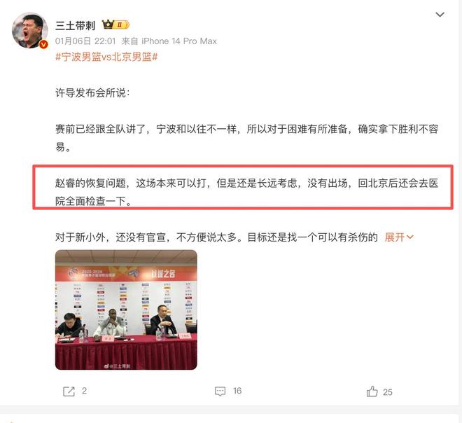 第二个消息,分享一下赵睿伤病更新的情况。各位球迷都知道,赵睿在最近加盟北京队之后,已经连续几场没有打比赛。其实很多球迷都关心他的伤病问题,到底恢复得怎么样。在最近结束了一场比赛之后,北京队的主教练在赛后的采访中主动谈到了赵睿的伤病恢复情况。