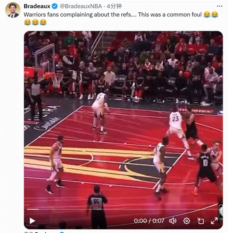 赛后火箭随队记者Bradeauxf晒出视频写道:“勇士球迷抱怨裁判吹罚...而这球却是普通犯规
