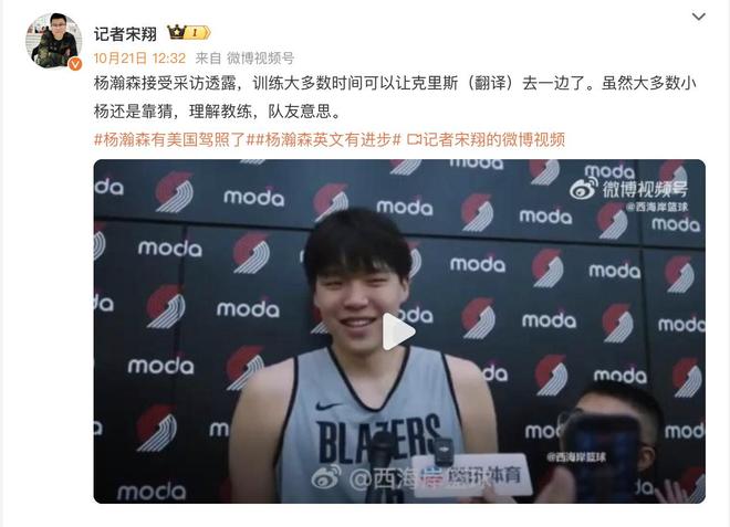事实证明大家还是过于操心了,因为从常规赛前夕的采访来看,杨瀚森的英语进步还是相当快的。首先在最新的采访中,其实大家可以看到杨瀚森虽然和他的翻译一起站在场边,但是在翻译开口之前,杨瀚森已经能够自主听懂NBA这边外国记者的提问。大概的意思已经明白了,只是说还不能够很好的用英文来表达自己内心的想法。