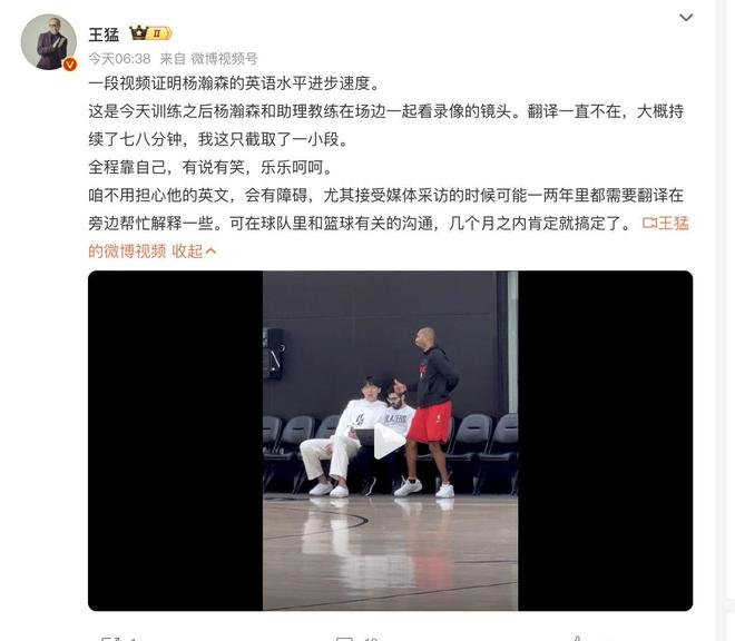 除此之外,最近还有媒体记者发布了杨瀚森训练的视频,可以看到他现在已经可以和球队的助理教练无障碍沟通,两个人在场边观看录像,进行复盘和总结,而他的翻译根本不在旁边。要知道这位助理教练是国外的工作人员,根本不会说中文,杨瀚森能够和对方进行沟通,足以证明他在英文方面取得了非常大的进步。所以说白了,外界之所以有些人一直批评杨瀚森,其实还是操之过急。想要新赛季开始之后,就能够看到杨瀚森成为NBA全明星的阵容,这是根本不可能的事情。