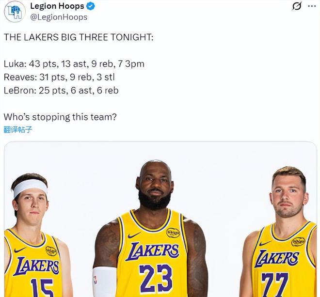 这就是湖人三巨头合体的完美效果,东契奇轰下43分9篮板13助攻,里夫斯得到31分9篮板3助攻3抢断,詹姆斯得到25分6篮板6助攻。三巨头联手贡献99分24篮板22助攻,率领湖人以135比118击