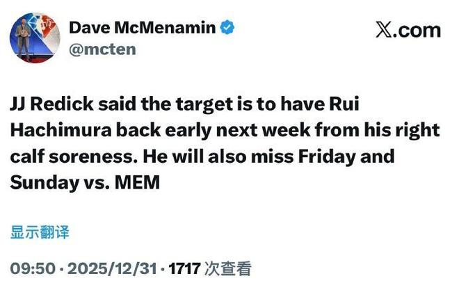 北京时间12月31日,湖人的伤病危机再度来袭,根据湖人主帅雷迪克透露,球队主力前锋八村垒因为右小腿酸痛,预计将缺席一周比赛。