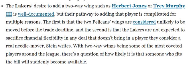 Stein表示,湖人想要引进赫伯特-琼斯或特雷-墨菲三世这类攻防兼备的侧翼球员,这一意向早已见诸报道,但他们完成这笔引援的难度不小,原因是多方面的。其一,鹈鹕队的这两位侧翼球员在交易截止日前被交易的可能性不大;其二,湖人方面不打算在任何交易中牺牲薪资灵活性,除非能换来他们认为能真正改变战局的球员。