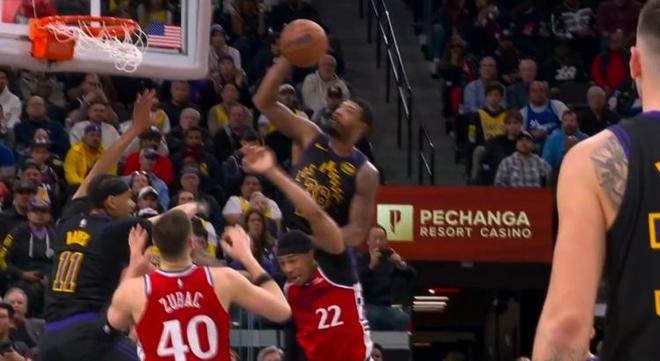 包括在比赛当中,莱昂纳德突到内线湖人4个人防守,詹姆斯一掌扇到他的肩膀上,范德彪还抓了他手一下,这球裁判也能不吹?小卡都急了。他打了三分钟4次突破被犯规1次没吹,泰伦卢赶紧把他换下,生怕他再突破就被湖人打死了。范德比尔特每一次对他的防守都在废人的边缘,八村塁生拉硬拽,詹姆斯偷偷下手。