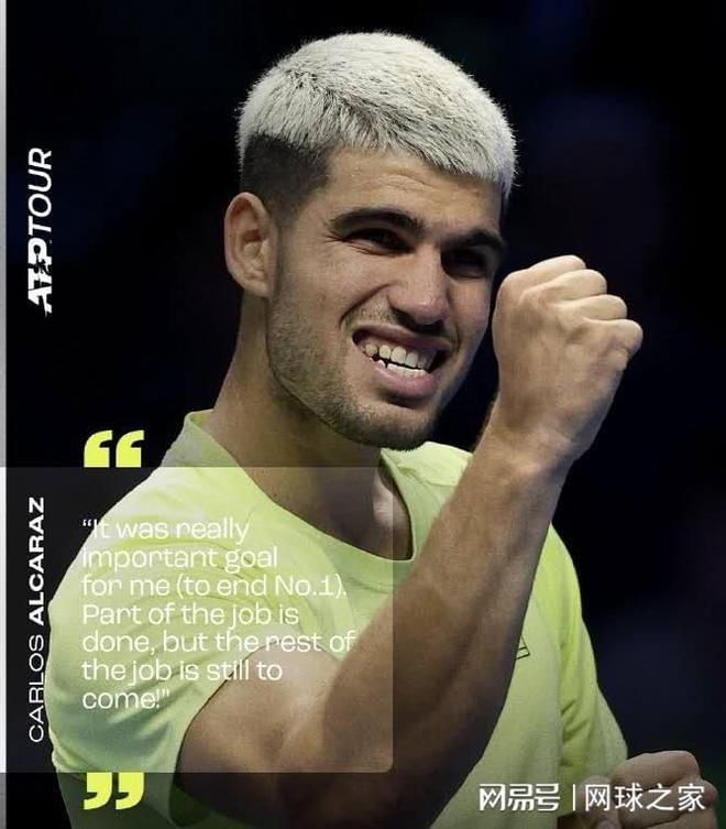 现在,阿尔卡拉斯在2025年都灵ATP年终总决赛小组赛,一胜连续两年闯进年终总决赛的澳大利亚小野兔德-米纳尔,再胜去年年终总决赛亚军、美国奶爸弗里茨,三胜首次闯进年终总决赛的意大利单反天才穆塞蒂,成功夺取了2025年ATP年终世界第一,如愿实现了第一个目标。正如阿尔卡拉斯昨天凌晨赛后接受现场采访时所说得那样:“我的第一项工作任务已经完成了,但是后面还有工作要做。”这就是瞄准第二个目标,积极备战半决赛。