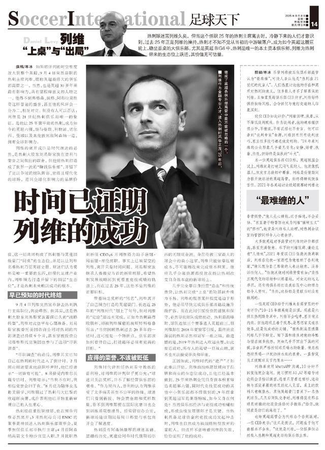 撰稿/寒冰如果将评判的时空维度放大到整个英超,9月4日突然辞职的热刺主席列维,堪称英超最伟大的俱乐部高管之一。当然,也是英超30多年来最有影响力,具有里程碑意义的人物之一。他得不到弗格森、温格、阿布拉莫维奇这样普遍的盛誉,甚至他的风评会一分为二,相互对立。但没有人可以否认:列维是21世纪热刺俱乐部唯一的象征。是他让25年前平庸的热刺,成为如今的英超六强,能与曼联、利物浦、切尔西、曼城以及北伦敦死敌阿森纳一道,拥有全球影响力。