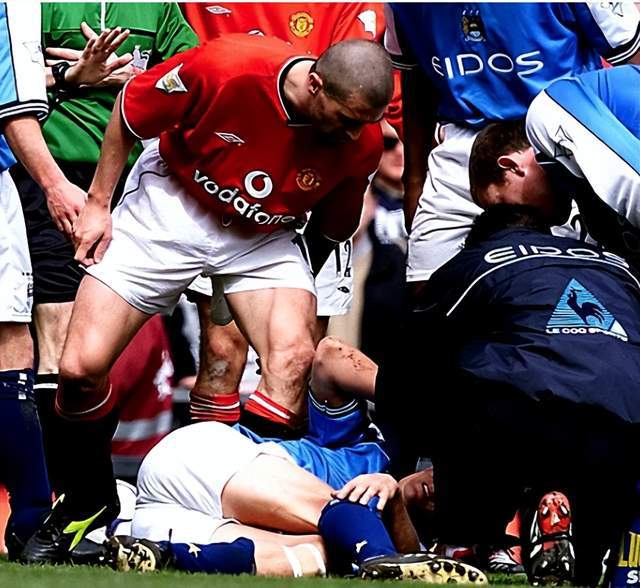 这是2000-01赛季英超第35轮的德比战。当时的曼城尚未崛起。这场比赛是双方恩怨的缩影:基恩铲断老哈兰德的小腿,完成“复仇”。老哈兰德因伤退役,基恩后来确认,他就是故意的。