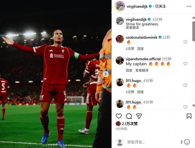 范迪克也在个人社媒晒出庆祝进球照片,配文写道:“努力追求伟大!”