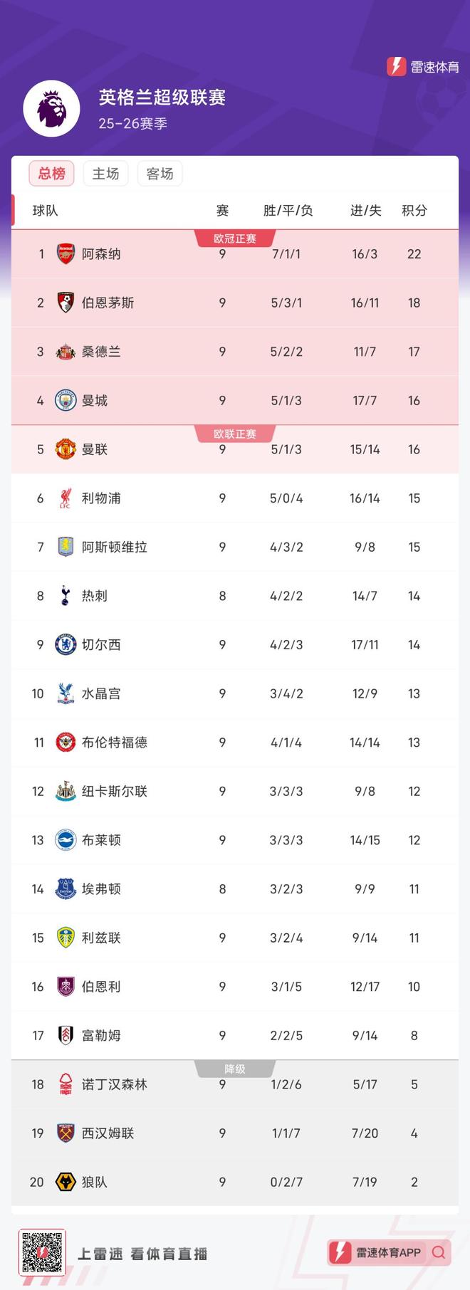 - 雷速体育10月27日宣 新赛季英超联赛来到第9轮,阿森纳继续领跑积分榜,但在积分榜紧追阿森纳的却不是利物浦、...发表于: 10-27 12:11