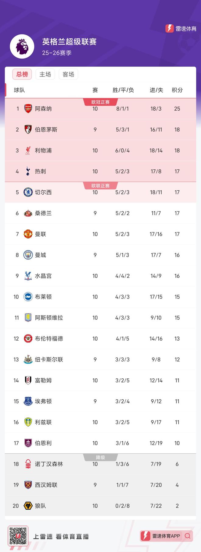 - 雷速体育11月2日宣 英超第10轮比赛已经7场战罢。最新积分榜方面,阿森纳8胜1平1负,目前以25分领跑。伯恩茅斯...发表于: 11-02 19:44