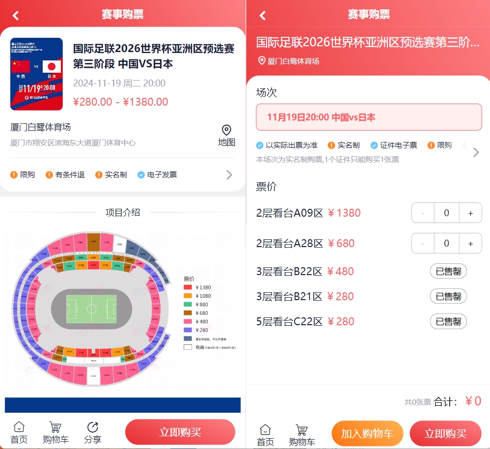 国足厦门主场vs日本下午17点开票,最低两档球票短时间内已售罄