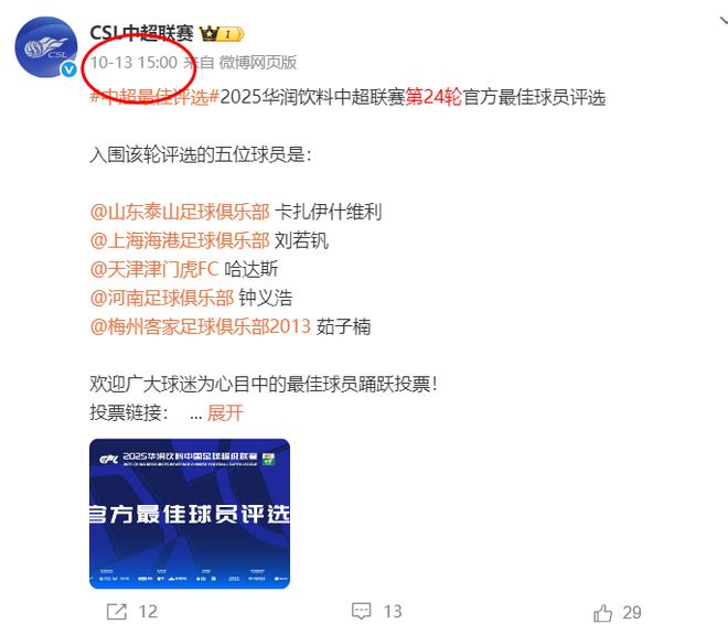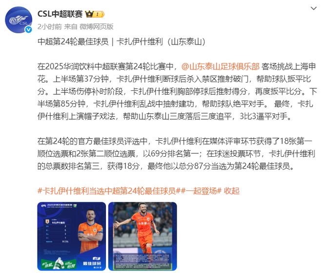 中超第24轮的最佳评选是10月13日开启,经过长达10天的评选后,结果终于公布。瓦科在第24轮对阵申花的比赛中上演帽子戏法,带队在客场3比3战平申花,他得到了69分的媒体评分,不过球迷投票只是排在第三位,得分是18分,总分是87分,当选单轮最佳球员。