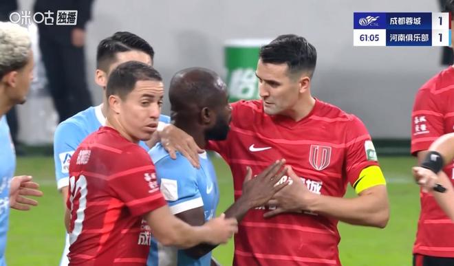 这一幕应该发生在比赛进行到第60分钟左右,当时成都蓉城外援古尔芬克尔受伤被换下,德尔加多刚刚登场,阿奇姆彭便被看台上球迷的歧视行为激怒,他情绪非常激动地向主裁判艾堃抗议,导致比赛一度中断。